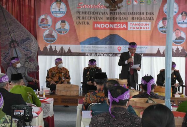 fokusbanyumas.id, Wonosobo – Forum Kerukunan Umat Beragama (FKUB) Provinsi Jawa Tengah menggelar Sarasehan Pemeberdayaan Potensi Daerah Percepatan Moderasi Agama Untuk Indonesia Tangguh dan Tumbuh, yang dilaksanakan di Pasar Ting Njanti Desa Kadipaten, Kecamatan Selomerto, Rabu (10/11/2021). Acara tersebut dibuka Bupati Wonosobo Afif Nurhidayat. Bupati mengatakan, fenomena heterogenitas bangsa ini merupakan realitas yang tak terbantahkan, bahwa Indonesia merupakan bangsa yang majemuk, memiliki keanekaragaman Suku, Agama, Ras dan Antar-golongan, namun disatukan melalui semboyan “Bhinneka Tunggal Ika”.