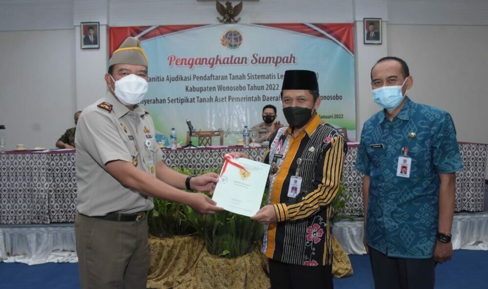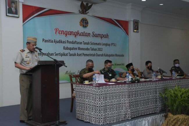 fokusbanyumas.id, Cilacap – Sesuai arahan Presiden Republik Indonesia, Jokowi target Pendaftaran Tanah Sistematis Lengkap (PTSL) Kabupaten Wonosobo dapat dirampungkan pada 2024. Merespon arahan tersebut, Bupati Wonosobo, Afif Nurhidayat dalam upaya mensukseskan PTSL 2022 menyampaikan perlunya sinergitas kolaborasi antara Badan Pertanahan Nasional (BPN) dengan Pemkab sehingga target PTSL 2024 dapat direalisasikan dengan optimal. “Pemkab memberikan dukungan sepenuhnya agar target PTSL 2024 tersebut dapat dipenuhi, ada beberapa desa di Wonosobo misalnya Leksono dan Kertek yang sudah selesai di atas angka 80%, artinya PTSL ini memungkinkan dijalankan secara optimal” kata Bupati saat sambutan acara pengambilan sumpah panitia Ajudikasi PTSL 2022 di Hotel Kresna, Selasa, (18/01/2022).