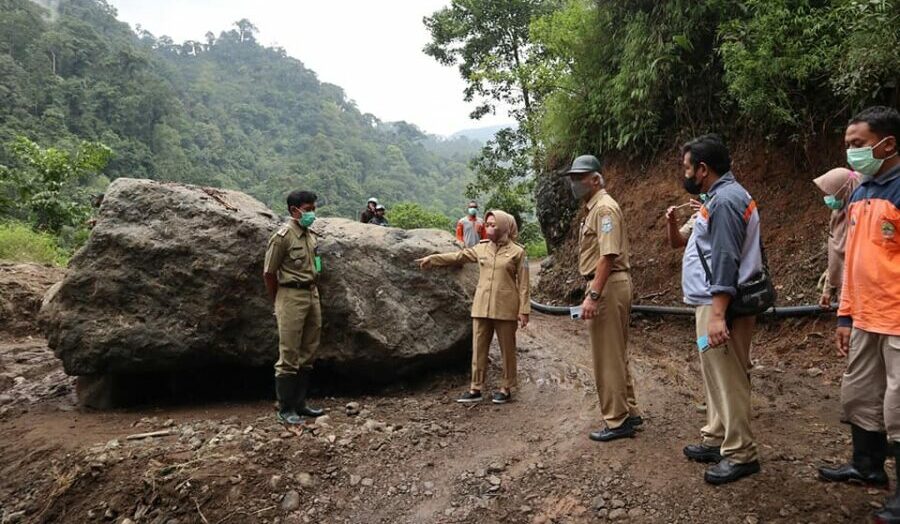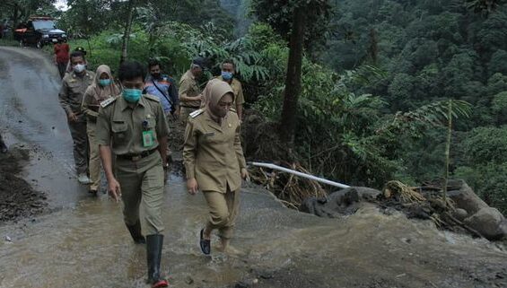 fokusbanyumas.id, Purbalingga – Bupati Purbalingga Dyah Hayuning Pratiwi SE BEcon MM., meninjau langsung tiga lokasi bencana di daerah Kecamatan Karangmoncol dan satu lokasi di Kecamatan Pengadegan, Senin (25/10). Kunjungan pertama ke lokasi tanah longsor yang ada di Desa Sirau, dilanjutkan bencana banjir bandang yang mengakibatkan tiga kios di pasar Runjang Desa Tunjungmuli hanyut terbawa arus sungai. Bupati beserta rombongan melanjutkan pantauan ambrolnya tanah di sayap jembatan sungai Karang yang menghubungkan Desa Grantung dengan ibukota kecamatan Karangmoncol. Terakhir melihat secara langsung badan jalan yang amblas di sisi timur Jembatan Merah masuk desa Tegalpingen Pengadegan.