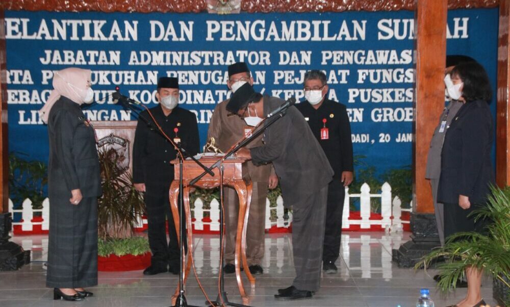 fokusbanyumas.id, Grobogan – Bupati Grobogan Sri Sumarni melantik dan mengambil sumpah 153 orang pejabat Administrator dan Pengawas di lingkungan Pemkab Grobogan di pendapa kabupaten, Kamis (20/1/2022). Selain itu, dilakukan pula pengukuhan penugasan Pejabat Fungsional sebagai Sub Koordinator di lingkungan Pemerintah Kabupaten Grobogan.