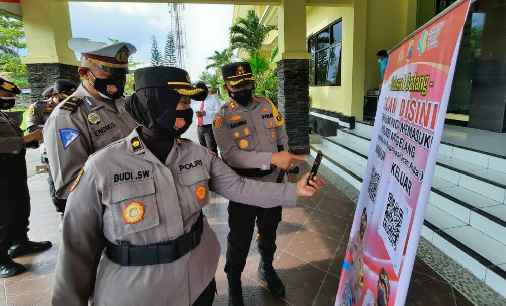 fokusbanyumas.id, Magelang – Anggota Polri dan masyarakat yang masuk Polres Magelang wajib Scan Barcode aplikasi Peduli Lindungi guna mencegah klaster baru di Polres Magelang. Fasilitas Scan Barcode telah dipasang di pintu masuk tepatnya di depan Penjagaan Mapolres Magelang yang diawasi ketat oleh petugas Polri.