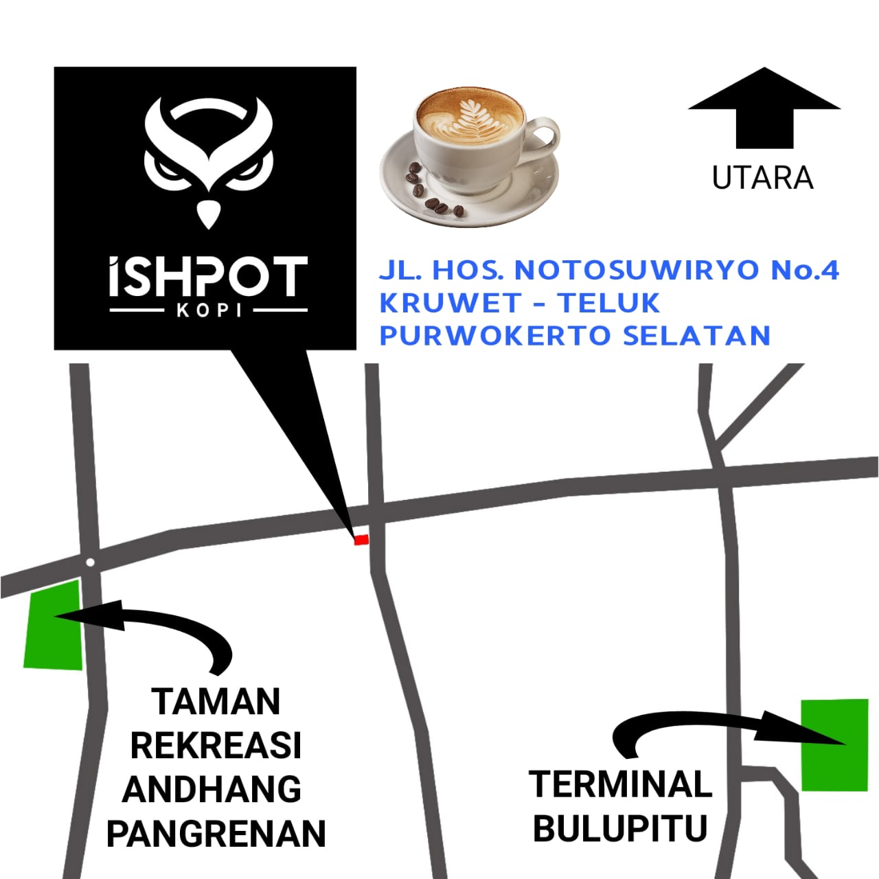 iSHPOT KOPI merupakan kedai kopi dengan konsep lain dari yang lain dengan mencoba menarik hati para penikmat kopi, gamers sekaligus penghobi kongkow. Selain beragam jenis kopi mutu tinggi, iSHPOT KOPI juga menyajikan beragam menu lain seperti aneka makanan siap saji. Kedai ini gampang dituju, beralamat di Jalan HOS. Notosuwiryo No.4, Teluk, Purwokerto Selatan. Lokasi persisnya ada di sebelah selatan lampu merah Karangbawang.