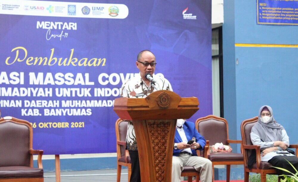 fokusbanyumas.id, Purwokerto – Pimpinan Daerah Muhammadiyah (PDM) Banyumas, bekerjasama antara Universitas Muhammadiyah Purwokerto (UMP), Pemda Banyumas, Kementrian Kesehatan Republik Indonesia, USAID, Mentari Covid dan Majelis Pembina Kesehatan Umum (MPKU) Pimpinan Pusat Muhammadiyah menggelar vaksinasi massal untuk 5000 warga di Banyumas. Acara digelar di Gedung Ukhuwah Islamiyah UMP selama dua hari mulai 26 – 27 Oktober 2021.