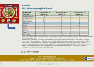 Bagi ibu hamil : pada makan pagi terdiri dari makanan pokok 1 porsi, lauk hewani 1/2 porsi, lauk nabati 1/2 porsi, sayur 1 porsi, buah 1 porsi, gula 1 porsi, lemak 1 porsi, dan air putih atau air mineral 2 porsi. Kemudian makanan selingan pagi yaitu makanan pokok 1/2 porsi, buah 1 porsi, dan air minum 1 porsi.