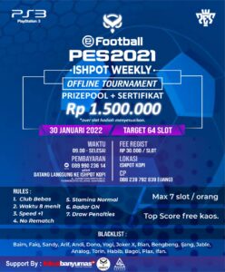 Nah, bagi kalian pecinta e-football dan penggemar Play Station (PS) 3, iSHPOT Network akan menggelar turnamen offline bertajuk “PES2021 iSHPOT Weekly Offline Tournament” pada Minggu (30/1/2022) mendatang.