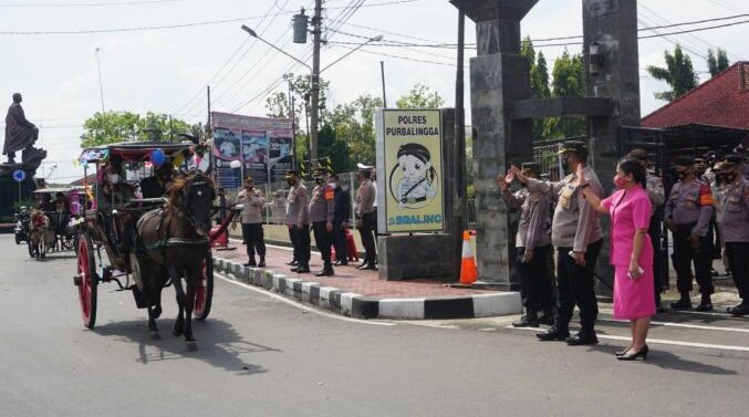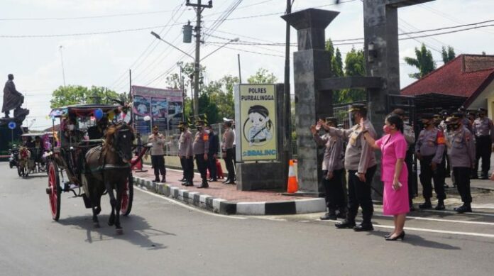 fokusbanyumas.id, Purbalingga – Ada hal berbeda dalam pelepasan purnatugas personel Polres Purbalingga, Jumat (28/1/2022). Setelah melaksanakan upacara purnabakti di halaman mapolres, personel yang telah habis masa dinasnya dilepas meninggalkan mapolres menggunakan delman hias.