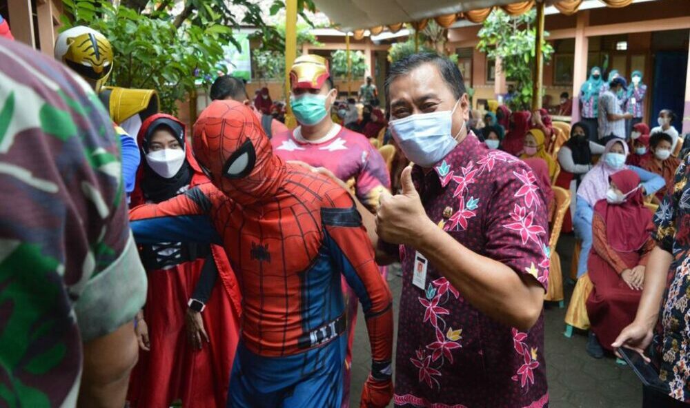 fokusbanyumas.id, Jepara – Tak tampak raut ketakutan di wajah anak-anak SD Negeri 1 dan 2 Robayan, Kecamatan Kalinyamatan, saat mengikuti vaksinasi Covid-19, Kamis (27/1/2022). Pasalnya, para petugas vaksinator dari puskesmas yang memberikan vaksin mengenakan kostum tokoh superhero, seperti Iron Man, Spider Man, Bat Woman, hingga Captain Amerika.
