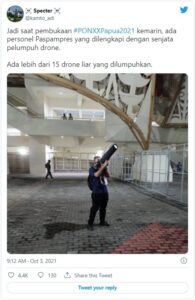Hingga saat ini, cuitan itu telah disukai lebih dari 4.400 akun dan di retweet lebih dari 1.000 kali, cuitan tersebut disertakan dengan sebuah foto, yang menampilkan seorang pria memegang alat berwarna hitam diduga alat pelumpuh drone yang tengah mengamati langit-langit di sekitar lokasi pembukaan PON XX Papua.